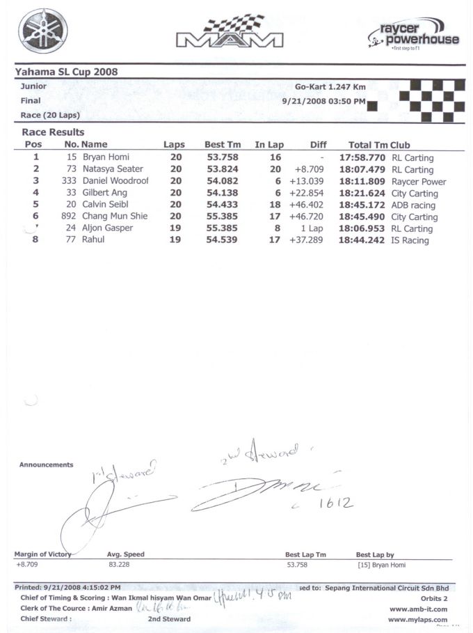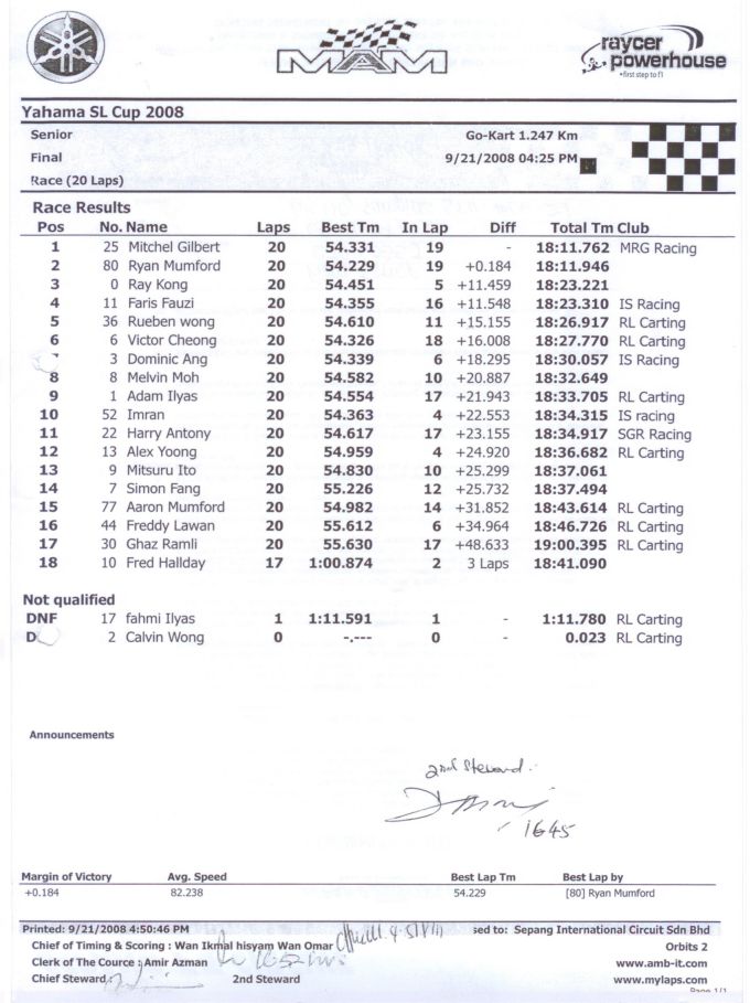The 3rd round of the Yamaha SL Cup Malaysia Series was held at Sepang last weekend. Mitchell Gilbert made his debut in the series holding off a late challenge from Ryan Mumford to win the Senior category. This results puts Mumford a very healty lead in the championship battle with Melvin Moh only finishing in 8th.