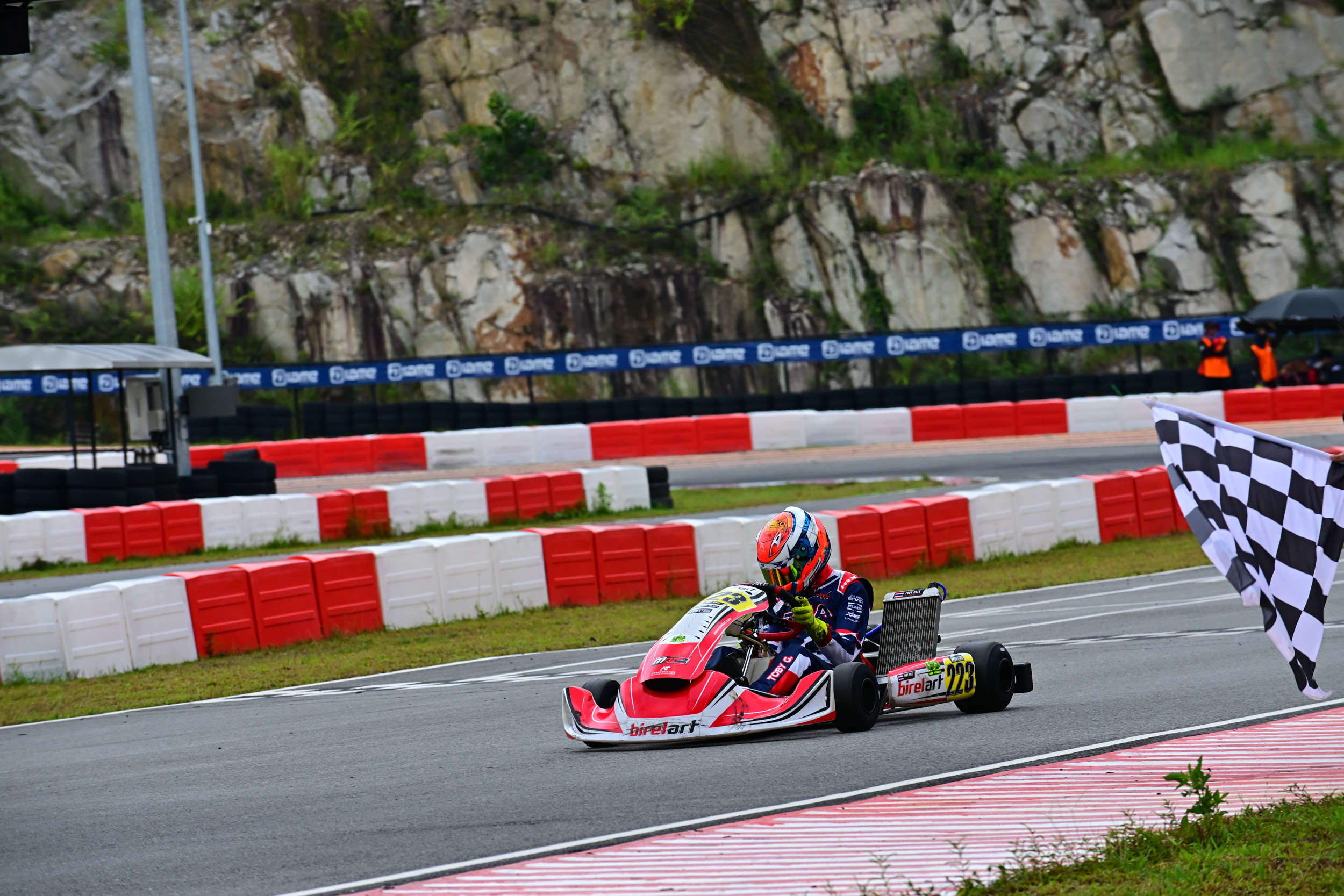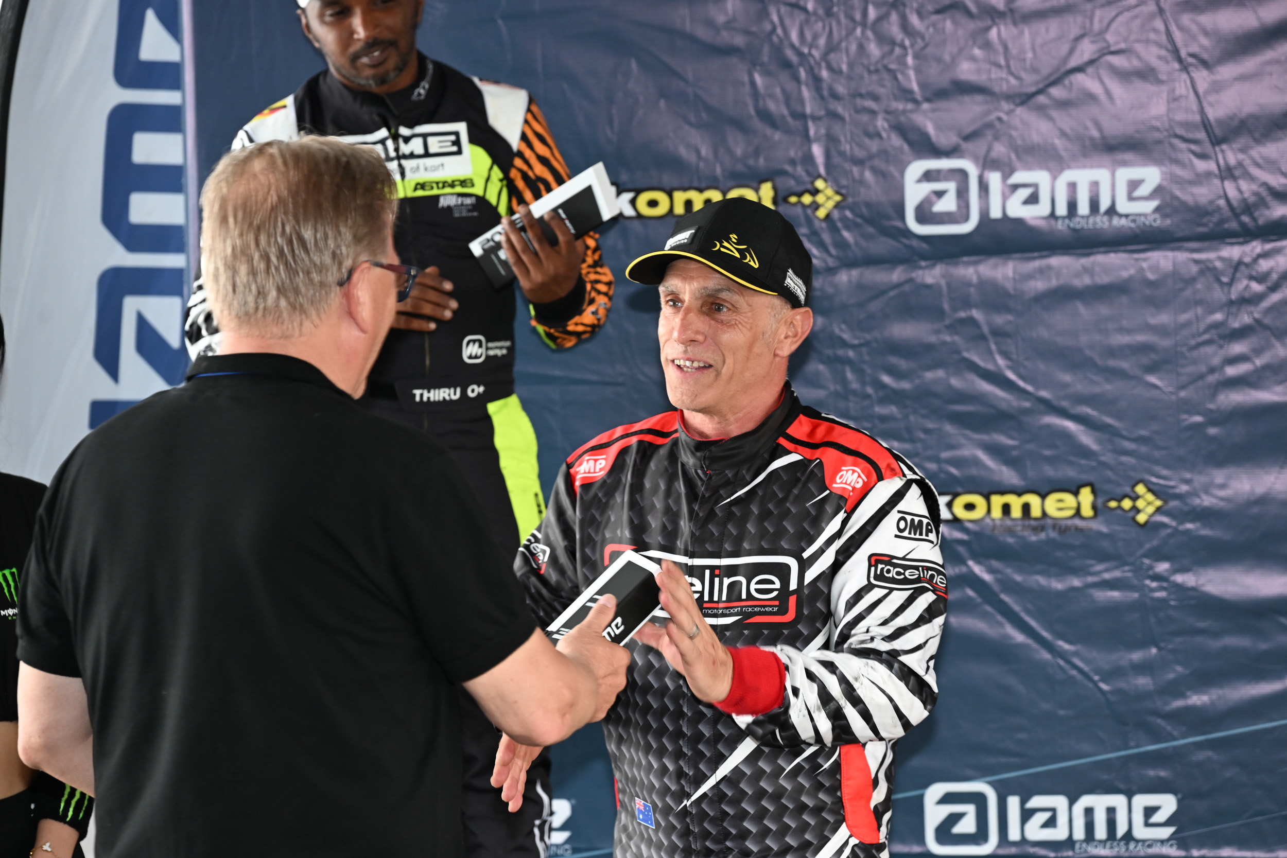 The Cadets were next and put on a show. With 4 laps to go, Mason Kwong had the lead ahead of Jay Kostecki and Posh Kongchol. Kostecki and Kwong battled hard and switched places several times, with Kostecki briefly falling back to third behind and Kongchol in the lead. The battle kept going all the way to the final lap, with Kostecki successfully defending to win the race, and Kongchol took the final overtaking move in the top 3 getting past Kwong in the penultimate corner to finish 2nd. The Cadets put on a masterclass in clean racing, it’s worth a look in the official IAME youtube channel!